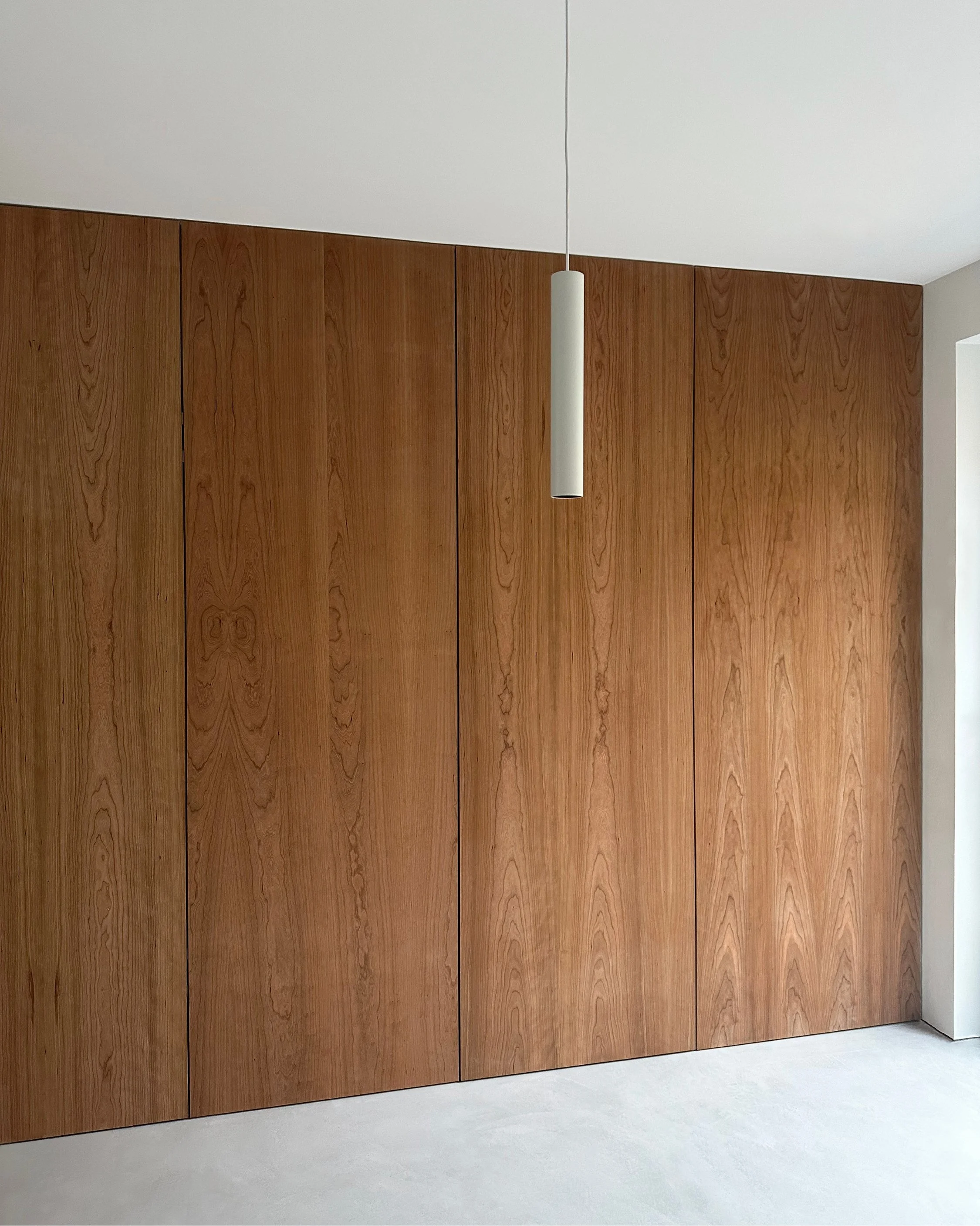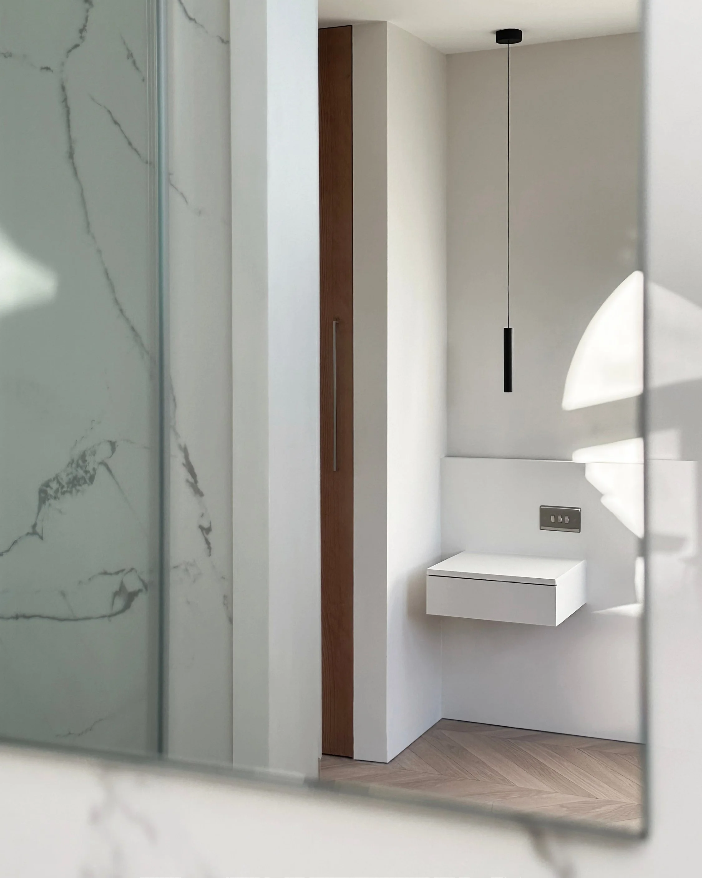 The architectural language is intentionally restrained. Full-height frameless doors, flush floor-to-wall and ceiling junctions, and finely crafted bespoke joinery create an interior that is calm and precise. A palette of natural materials — timber and marble used across all touch-point surfaces — introduces warmth and tactility, resulting in a home that feels light, considered and quietly confident.