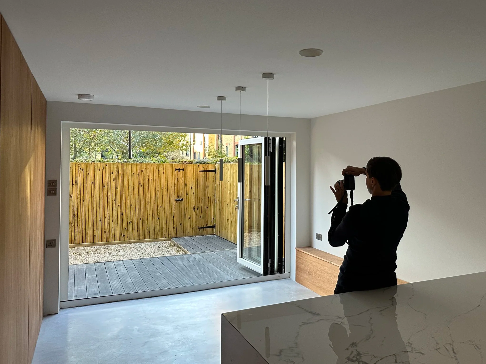 The ground floor is conceived as a social heart, with a kitchen and dining space designed for entertaining and connected directly to a small garden. Above, the first floor is dedicated to family living, while the upper levels accommodate sleeping and working spaces, each responding to the home’s vertical rhythm.